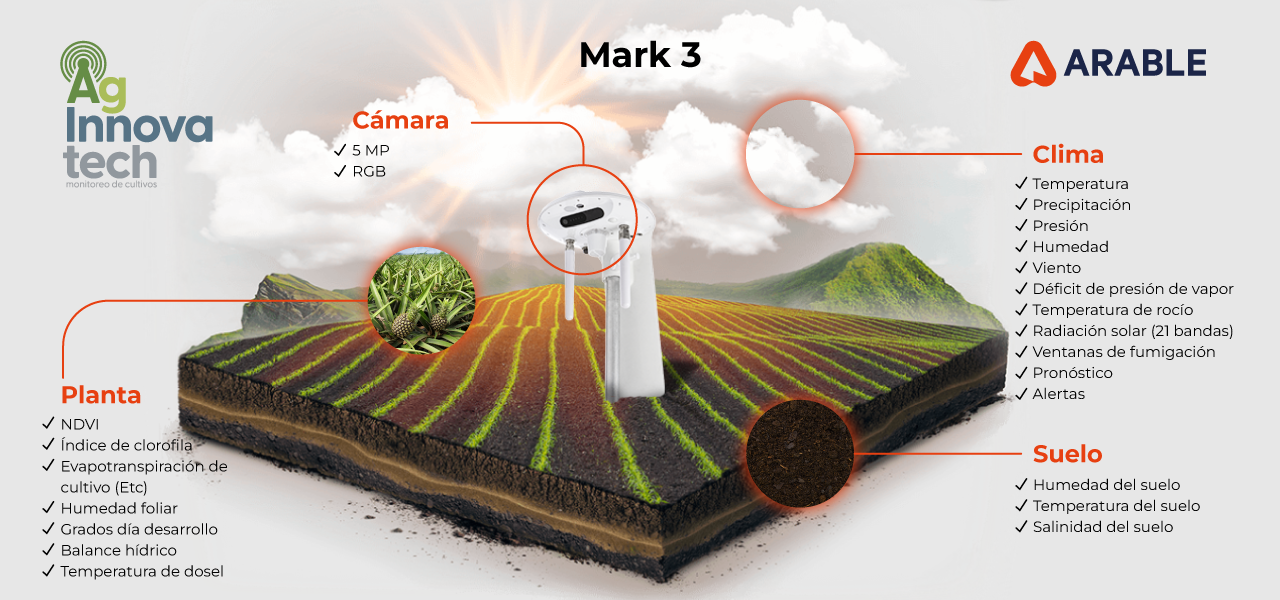 En Aginnovatech, nos enorgullece ofrecer soluciones tecnológicas de vanguardia para el sector agrícola. El Sensor Mark 3, es una estación meteorológica y monitor de cultivos todo en uno, diseñada para brindar datos precisos y en tiempo real sobre clima, suelo y salud vegetal. Esta herramienta avanzada permite a los agricultores maximizar la productividad y eficiencia de sus cultivos.